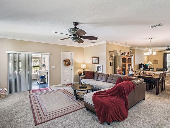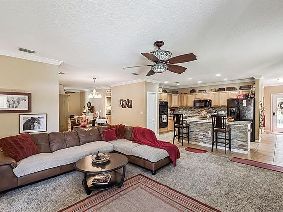 A MUST SEE! This 3 bedroom 2 bathroom home has been meticulously maintained. As you enter you are greeted with a long hallway. To the right is a MUD room with a granite counter top, leading to the large 3 car garage, currently set up as a vehicle workshop with plenty of storage. Each bay is equipped with air compressor hoses. It also has a vent for a portable AC unit. The Laundry room has floating shelves. Past the hallway is the kitchen with built in NEW double convection ovens, stove-top, microwave, solid wood cabinets including a lazy susan in the bottom corner cabinet and granite counter tops. Kitchen Island has had a upgrade with intricate stone detailing and overlooks the large living room, perfect for entertaining. Office/Den is off the living room and has also had a upgrade with built in desk, shelving, granite counter top and the same stone detailing as the island. Home has crown molding throughout. Master bedroom comes complete with a good sized bathroom with dual vanities and walk in shower. Guest bathroom also has two vanities and a shower/bathtub combo. The backyard is your oasis, you can either relax in the Florida room, with screened in windows closing or open them all up and enjoy the breeze. There is a paved patio area also, perfect for entertaining. Backyard is fenced and nicely landscaped. It has a waterfall tucked in the corner. The House is wired to have a home generator hook-up, including the slab outside. It is also set-up for wall interior pest control. The home has extra insulation, and has gutters! Call to schedule your visit.