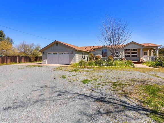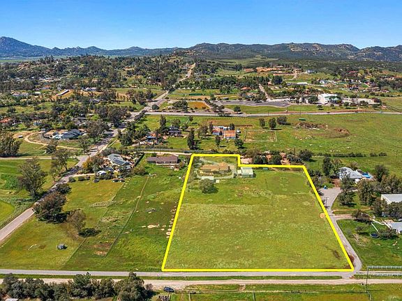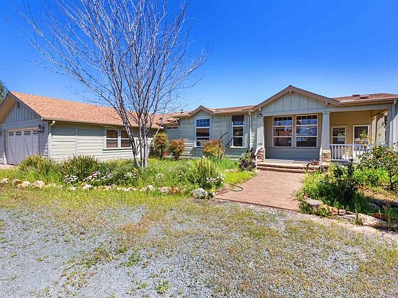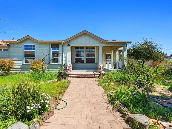 Great opportunity to own a charming SINGLE STORY home in Ramona on 4.27 acres of land with great potential! This Ranch style home offers 3 bedrooms, 2 full baths, 1,897 ESF and a 2 car attached garage. Great open feel with vaulted ceilings and oversized kitchen with center island opening up to the spacious nook, dining area and living room. Large master with ensuite bathroom and walk-in closet and quality upgrades include newer vinyl plank flooring and freshly painted interior throughout. Manufactured home on permanent foundation and owned land. Property is on septic and propane, and home is equipped with interior sprinkler system. Large covered patio adjacent to the home and wonderful Easterly mountain and valley views from this flat, usable lot. The property also features a detached 4 car garage structure plus a storage/workshop area and an office with ½ bath (permits unknown for these additional structures). Water well on the property as well as multiple water tank storage. Room dimensions & square footage are approximate, per builder & assessor’s record. All MLS & marketing info is approximate & not guaranteed.