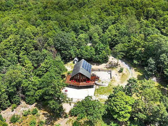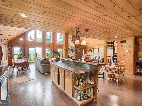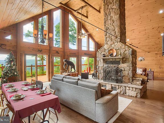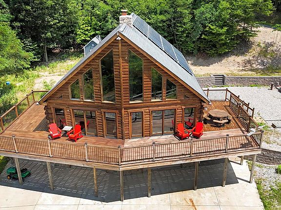 Welcome to this stunning, self-sustaining property that combines rustic charm with modern amenities. Nestled on 125 acres sits a spacious and luxurious log cabin that is perfect for those seeking a private, serene retreat. The cabin boasts high-end finishes and materials, including beautiful natural wood finishes, stone accents, and large windows that showcase the breathtaking views of the surrounding countryside. Powered by solar panels, this self-sustaining cabin offers an eco-friendly and cost-effective lifestyle ensuring that the home is always equipped with the necessary resources. Inside the cabin, you will find an open and inviting floor plan that is perfect for entertaining guests or relaxing after a day flyfishing on the river. The spacious living room features 25’ ceilings, a stone, double sided, floor to ceiling, wood burning fireplace flowing into the large, fully-equipped kitchen complete with granite countertops, custom knotted pine cabinetry, stainless steel appliances, and a large island with room for seating. The cabin features 3 bedrooms and 3 bathrooms. Two bedrooms are situated on the main floor, and upstairs you can find a massive primary bedroom featuring 13’ beamed ceilings. Additional sleeping areas can be made available in the loft outside of the primary, overlooking the family room. The lower level features a laundry room, a workshop area, a bonus room, and additional storage. You can also find 2 large garage stalls with 8’ doors. Outside, the property offers an 1,100 sq ft, wrap around deck offering picturesque views of the mountains. The property's acreage includes plenty of open land, wooded areas, and is situated in close proximity to Raystown Lake, State Game Lands and Blue Knob Ski Resort, this property offers easy access to recreational activities like hiking, fishing and quad riding. With its stunning views and peaceful setting, this is the perfect place to escape the hustle and bustle of everyday life and immerse oneself in nature. Additional highlights of this home: well water is processed through a brand new, hi-tech water conditioning and filtration system, a septic system, a 1,000 gallon propane tank to provide gas needs for cooking, central heat and a backup generator. The property sits on Marcellus Shale and natural gas rights convey. *Pre-qualified buyers only