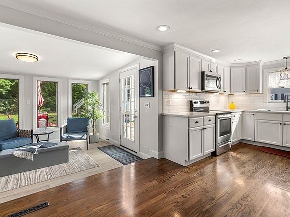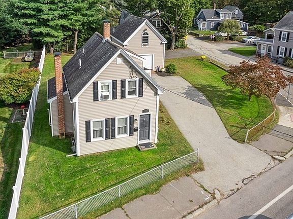 This beautifully renovated home, set on a corner lot, combines modern living with classic charm. The first floor boasts a newly renovated kitchen, a fully updated full bath, an open floor plan that seamlessly blends a dining area with a family room featuring a wood-burning stove, and a bedroom, all graced with beautiful hardwood floors. Step out from the sunroom onto the expansive back deck and enjoy seamless outdoor entertaining in your lush and private backyard. Upstairs, you'll find two more bedrooms and another renovated full bath. The detached barn adjacent to the house is a unique asset. It has its own driveway, a new heating system, a bathroom, and a versatile large space with a vaulted ceiling that could serve as a 4th bedroom, a home office, or a game room, ideal for those who work from home or need flexible living space. Conveniently located, this property offers easy access to the commuter rail, bus 222, nearby trails, parks, Whitman's pond & beaches. A well-maintained home!