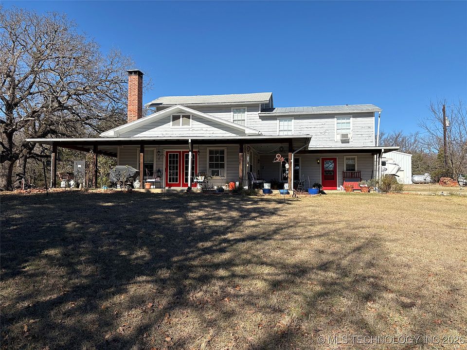 Tucked away in the scenic countryside of Southeastern Oklahoma, this remarkable property at 1183 Romia Road in Bokchito offers the perfect blend of privacy, comfort and outdoor living. Although the address is Bokchito, the home is ideally located closer to Highway 78 in Yuba, just minutes from the Red River and Texas state line. This custom built, two story home features 4 bedrooms , 3 baths and a thoughtfully designed living space. A spacious wrap around covered porch invites you to sit back and enjoy the breeze, beautiful trees and landscape. Inside, a large fireplace serves as the heart of the home, efficiently heating the downstairs living area during the winter months. The main level includes a generously sized bedroom that was originally designed as a mother in law suite, offering flexibility for guests or multigenerational living. Set on 40 Acres, the property is a true outdoor paradise. Mature trees frame the home and overlook a serene pond area below. Two ponds, a large cistern with goldfish, and land create endless opportunities for hunting, fishing (Not the goldfish!) and recreation. A 40 x 50 shop building is equipped with a 50 amp plug for a RV with underground electrical service, complimented by addition storage buildings and a shed for some chickens. The owned propane tank will remain with the property. Whether you are seeking a peaceful retreat, a homestead, or a place to enjoy the best of country living, this one of a kind property delivers space, beauty and freedom in a stunning Southeastern Oklahoma setting.