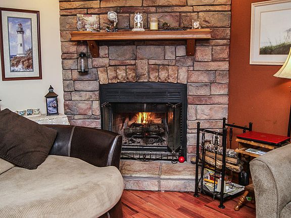 - Fireplace features: Wood Burning, Stone, Glass Doors