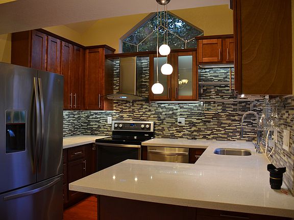 - KITCHEN FEATURES: 220 Volt Outlet, Dishwasher, Garbage Disposal, Range/Oven Free Standing, Counter - Solid Surface, Refrigerator, Updated Kitchen, Counter - Laminate, Counter - Stone