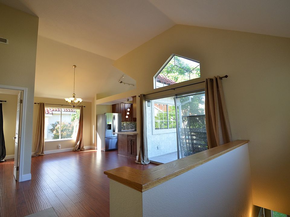Elegant Kildara Townhouse Style Home Completely Renovate, Private End Unit location in front of greenbelt in quite & park-like community. This Bright & Open Floor plan offers High Ceilings & Excellent Lighting. Cozy Gas Fireplace in living room. A Perfect Large Balcony for entertaining. Modern Newer Kitchen with Quartz counter tops, glass tile back splash & stainless-steel appliances. Tastefully Updated Bathrooms. Gas Fireplace.Convenient Indoor Laundry with stackable Washer/Dryer included. Immaculate laminate floors & new cabinets throughout. Central heat & A/C. 1-car attached garage with one assigned parking space included. Nice community pool and spa. Community close to BART and Stoneridge Mall, easy access to 680/580 & walking distance to shopping & restaurants! Living area all on one floor. Washer/Dryer/Fridge included. HOA includes water/sewer & trash too! Just Move in and Enjoy! Luxury & Convenient Lifestyle?a must see!