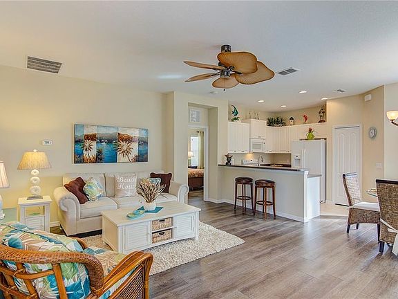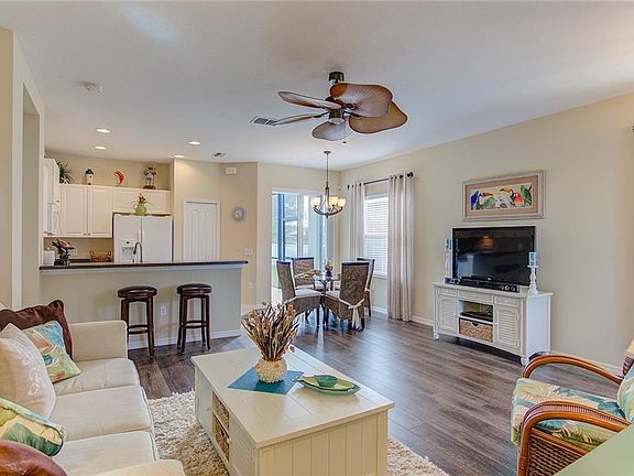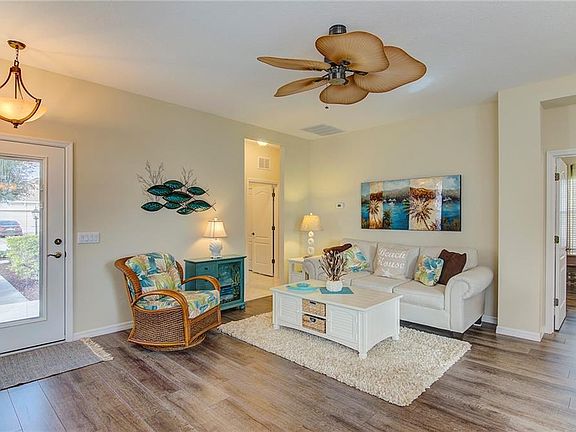 This fabulous Forest Creek home shows like a model! This barely lived in, well-maintained home is move in ready. You will be impressed with the gorgeous textured laminate floors in the bedrooms/closets, living room, dining room and hallway. The home also has tile in both bathrooms, laundry room and kitchen. The beautiful kitchen boasts Corian countertops with a high bar for entertaining. Enjoy the open concept floor plan with natural lighting and ceiling fans in the living areas. The over-sized, partially covered screened in lanai is great for relaxing in the outdoors. Another wonderful feature is having no neighbors in the back! Come see the gated community of Forest Creek, and feel the tranquility of this beautifully manicured Neal Community close to Fort Hamer Bridge and approx. 30 minutes to the beaches. You will love all the wonderful community amenities such as the dog park, nature trails, resort-style pool, hot tub, basketball court, playground, 24hr fitness center and fantastic clubhouse. You can also enjoy canoeing and kayaking on an 18 acre lake with 2 gazebos. Being only a few miles from the interstate, Forest Creek is conveniently located between St. Pete and Bradenton. CDD fees are included in the taxes & HOA fees are very LOW. Click on virtual tour link for a 3-D walk through experience.