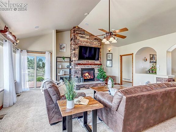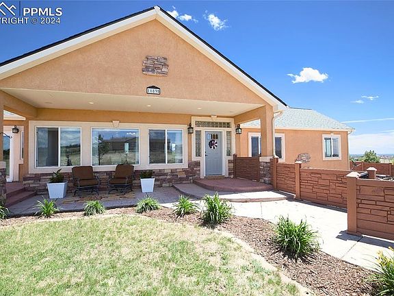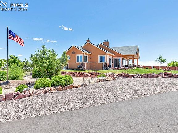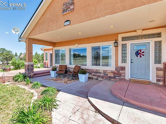 Welcome to Camelot. 2.98 acres complete with landscaping and Pikes Peak/Front Range views! This 5 bed, 4 bath home also features a dedicated office, great room, formal dining, and a 2,250 sf shop (1500 sf 750 sf loft with separate office). A new paved driveway, new roof, new energy-efficient front door, & sliders were done this year. Over 1800 sf of amazing outside living space. This is a warm and inviting home, with tile floors throughout the traffic areas, features a great kitchen with granite counters, double ovens, an island workspace, and a built-in desk space in the cozy nook to sit back and read or enjoy your morning coffee/ 2nd eating area, walk-in pantry. The dining area that looks out to the great room & kitchen, flows to a covered back patio area. There’s lots of entertaining possibilities. A front covered patio for both the great room & primary retreat complete w/dual fireplace & luxurious primary bath with heated floors. The opposite end of the main level has 2 beds, 1 bath, offering privacy & convenience. The 3 car, finished, oversized garage is off the main level. Your basement walkout has a large family room w/ third fireplace, a large wet bar with full-size fridge two bedrooms with a full bath on one end and an office, second bath, media room with projector/screen/speakers, plus additional flex room (gym) walking out to the sunny recessed outdoor living space complete w/rock retaining walls, mature plantings, hot tub, fire pit, and shade sails. The shop is a 30x50 stucco, heated*insulated building*w/220*1/2 bath plumbed/roughed in. Included is the 10K lb lift, compressor, & 220-volt hook-ups. Additional workspace in the loft is ideal for the hobbyist plus a contained office. Other amenities*networked Ecobee thermostats, whole house/shop mesh wifi, 2 laundry areas (main/bsmt w/gas), abundant cabinets, recirculating hot water, community water, zoned horses. You're only minutes from all the new restaurants and grocery stores.