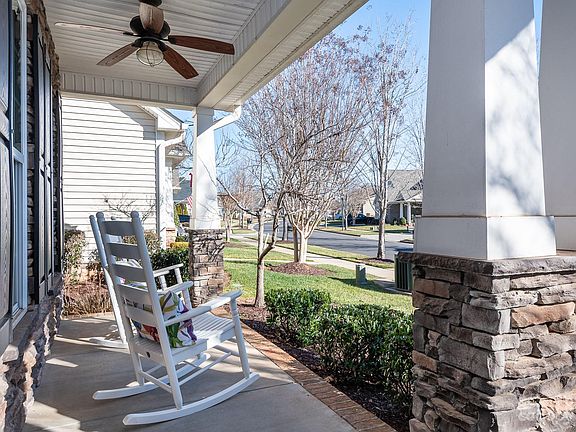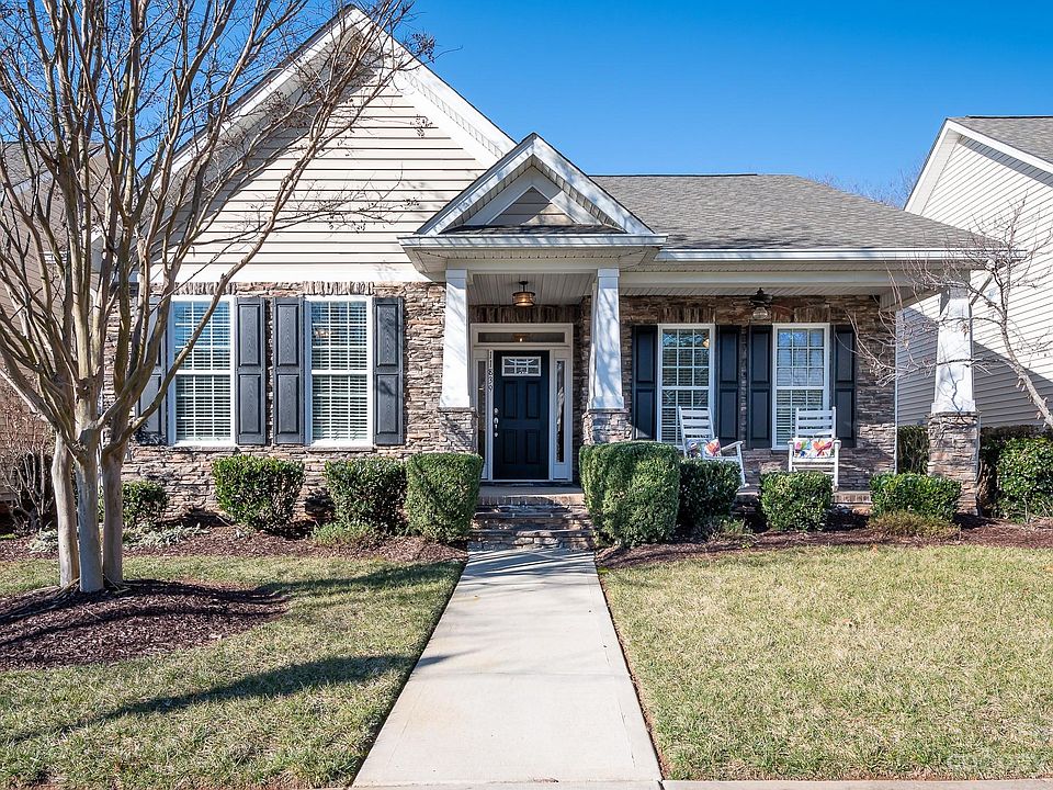 Enjoy this generously enhanced and spacious Hunter house plan in premier 55+ community. Beautiful stone front home with rocking chair front porch enters into inviting, extended foyer and large, open great room, tray ceiling with wainscoting. The location is fabulous!! Live like you are on vacation all year just steps away to Clubhouse, pool and activities or enjoy your very private treed yard off of enclosed sunroom or back screened porch. Home has brand new Luxury Vinyl Plank flooring and interior has been recently refreshed and painted. Lighting is upgraded, granite countertops throughout, beautiful cream colored cabinets, stainless appliances and laundry room with handy laundry tub. Washer, dryer and kitchen refrigerator are included in the sale however the Safe and Refrigerator in garage do not convey. This is truly a Beauty!