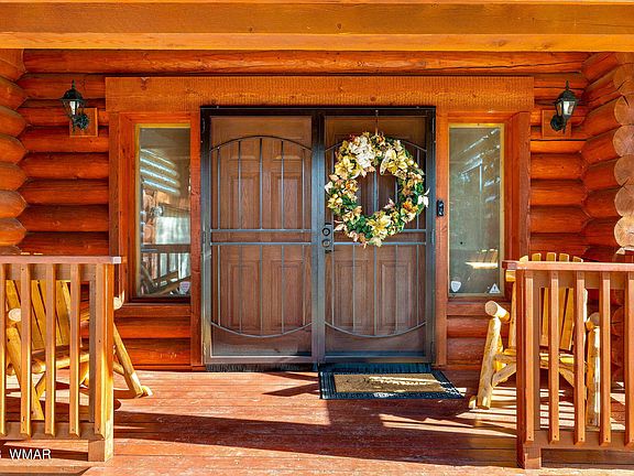 Step inside this 5-bedroom, 3.5-bath retreat & be embraced by the warmth of log details. The main level captivates w/ breathtaking views through picturesque windows, while the living room boasts a stone-to-ceiling wood-burning fireplace, creating the perfect ambiance for cozy evenings.
