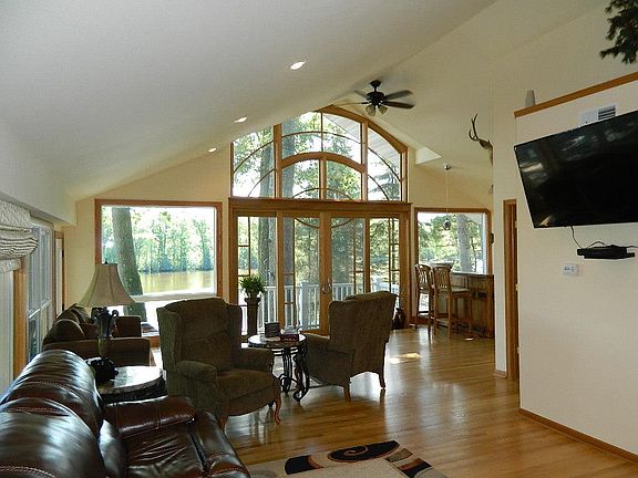 I promise you the first words out of your mouth when you enter this home will be WOW What a View! The amazing views of the water flow all the way through the home. This is basically a brand new home on an existing foundation. The sellers spared no expense to make this a perfect weekend retreat or full time residence. Almost the entire main level is solid oak hardwood floors, there are expansive vaulted ceilings throughout. The one of a kind custom $26,000 patio door/window will take your breath away.Kitchen was thoughtfully designed and includes Oak cabinets, granite counter tops and a walk in pantry. The great room is large and L shaped offering you multiple seating and entertaining areas. There is a beautiful gas fire place accented with stone. Master suite includes his and her closets and a private master bath the whirlpool tub, separate shower. There is also an additional bedroom and full bath. There are two 2 car garages and one of them offers a second floor currently being used for storage but could possibly be finished as a guest room. The yard and landscaping is just as beautiful as the house. All new terracing and steps leading down to the water were added. This is probably one of the only homes on water in the entire area that has a deck that extends over the water. All the rock used in the landscaping was purchased from a quarry in Wisconsin. The rock is beautiful and very hard to come by. Because this home includes two lots you are allowed 2 docks so plenty of room for your friends to come visit by water. Last but certainly not least you will absolutely love the custom eagle wood carving. Words can not fully describe how beautiful this property is. Truly a one of a kind find.