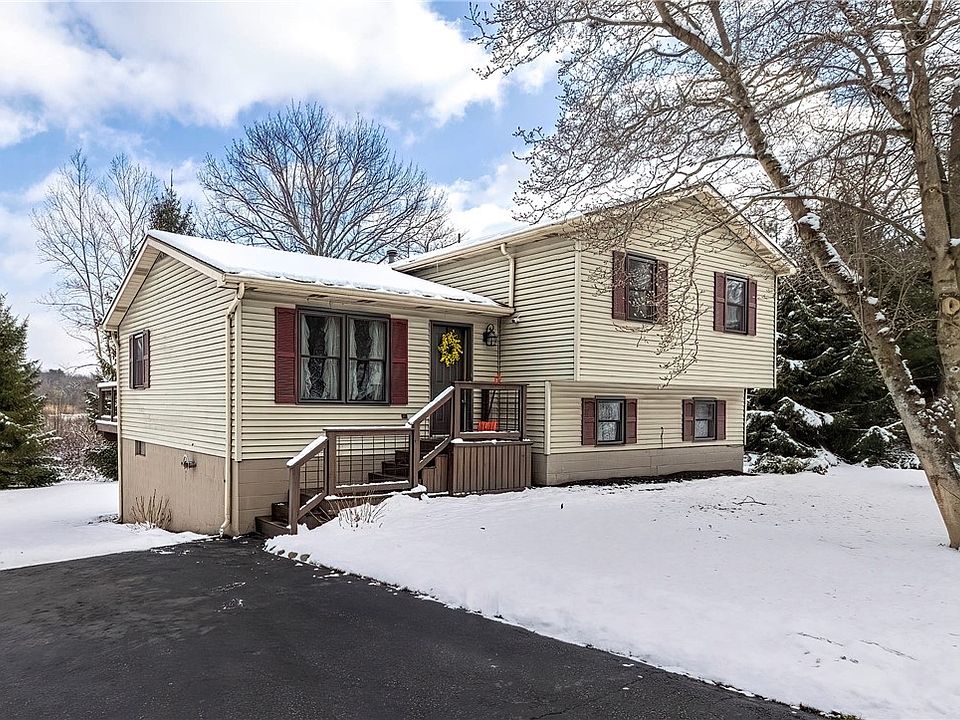 Unique country tri-level on 1.98 acres in Waterford. This 1 owner home features 4 bedrooms, 1 bath & plumbing for 2nd bath in lower level. Eat-in kitchen with deck overlooking views of pond & treed landscape. Lower level features rustic wood family room. Updates include roof, windows, and doors. Also - extra parking pad for ease out of drive or extra vehicles, etc.