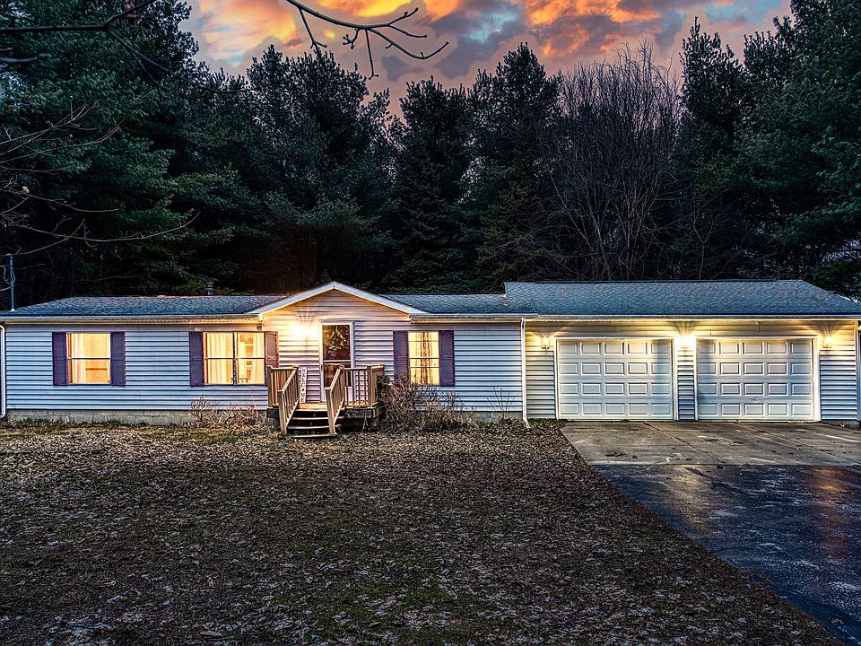 House sits far back from the road on a cement and blacktop driveway with a 2-car attached garage. The property is beautiful and heavily treed and offers possible splits for future expansion. (Use the existing house as a rental and build your new home in the back) Or keep it as is and utilize the 5 acres for your own enjoyment. Horses, mini farm, dirt track, flowers and/or fruit production, etc. **(All according to Conway twp. rules and regulations of course)**