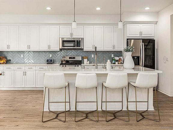 Discover this beautifully designed 3-bedroom, 3-full-bathroom home located in a master-planned community that offers the perfect blend of luxury and functionality. The open great room layout flows seamlessly, creating an inviting space ideal for both everyday living and entertaining. The kitchen is a true centerpiece, boasting quartz countertops, a custom ceramic sink, a sleek glass tile backsplash, and an upgraded Moen faucet for a touch of elegance. On the main floor, you’ll find a convenient bedroom and full bathroom, perfect for guests or multi-generational living. The luxury vinyl plank flooring extends throughout the downstairs, stairs, and all bathrooms, offering durability and style. Custom shades on every window ensure privacy, with blackout shades in the primary bedroom for restful nights. Natural light pours into every room, enhancing the home’s warm, inviting ambiance. Step outside to enjoy a fully landscaped backyard with a custom patio shade, creating an ideal outdoor retreat. The garage features a custom epoxy floor, combining style with practicality. Situated within walking distance of a brand-new elementary school, this home is part of a vibrant community offering exceptional amenities, including three parks, a fully equipped gym, and a luxury pool area. Embrace a lifestyle of convenience and elegance in this beautifully upgraded home, crafted with care and situated in a welcoming neighborhood.