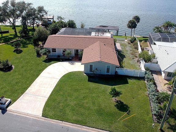SEE 3D TOUR & FLOOR PLAN for this Indian River front charmer w/a BRAND NEW ROOF, NEW A/C, RESURFACED POOL & SPA, & NEW EXTERIOR PAINT! Celebrate 100 feet of panoramic water vistas! Park your boat at your private dock. A bonus rm. in the garage with a/c could be another bdrm. Or, easily convert back into a 2-car garage! Hurricane rated windows & doors welcome natural light, as French doors off the family rm. & master open to an oversized lanai, pavered patio & fenced backyard. Parquet oak wood & tile flooring underscore the entire home. Custom glass door cabinetry offers plenty of storage in the bfast bar kitchen & a stately brick & marble fireplace hallmarks the big family rm. Built-in storage, granite counters & an ultra modern walk-in tiled shower highlight the renovated master suite.