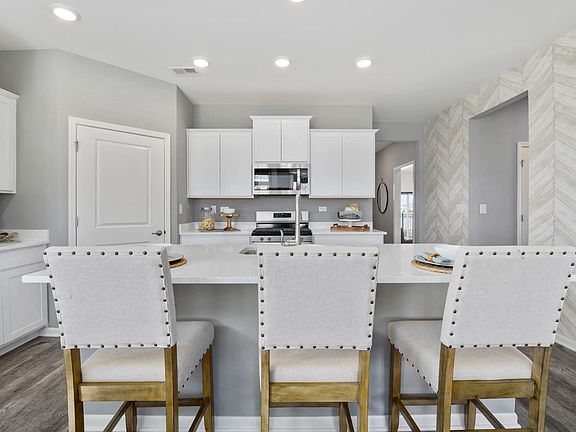 Carillon at Cambridge Lakes Active Adult Community Arlington Model with a 3-car garage is now for sale with a spring move-in! The gorgeous builder's model is the home you have been waiting for! Professionally decorated and move-in ready - comes complete with custom window treatments, custom paint, custom wall coverings, and all appliances including the refrigerator, five burner range, microwave, and dishwasher - all stainless steel and the laundry room comes with the washer and dryer. The awesome floor plan is open-concept living at its best! The kitchen is open to the dining and living space and has 42" white designer cabinets with crown molding, a generous island with quartz countertops, an under-mount sink, a sleek gooseneck faucet, all stainless steel appliances, and a corner walk-in pantry. The primary bedroom suite comes with a private bath with a tile walk-in shower, double sink vanity, and a huge walk-in closet. The second bedroom and hall bath are situated away from the primary bedroom. Home also includes a tucked away den -perfect for an office, TV room, or could be a guest room! Generous homesite is fully sodded and landscaped and situated on a quiet cul-de-sac. The nicely sized backyard that you can enjoy from your covered patio and don't worry you won't have to cut the grass at this low-maintenance community (or shovel snow)! Be good to yourself and give yourself this wonderful gift of a beautiful home in an amazing community where you will enjoy each day discovering new activities and wonderful friendships at the 30,000 sq foot clubhouse exclusive to the active adult community. The clubhouse has an indoor pool, outdoor pool, fitness center, game room, library, and party room with kitchen. The community has parks, lakes, and miles of walking paths. All Chicago homes include our America's Smart Home Technology which allows you to monitor and control your home from the comfort of your sofa or from 500 miles away and connects to your home with your smartphone, tablet or computer. Home life can be hands-free. It's never been easier to settle into new routine. Set the scene with your voice, from your phone, through the Qolsys panel which you can schedule it and forget it. Your home will always await you with your personalized settings. Our priority is to make sure you have the right smart home system to grow with you. Our homes speak to Bluetooth, Wi-Fi, Z-Wave and cellular devices so you can sync with almost any smart device. Photos of actual model home, furniture not included. Overhead garage doors to be installed and driveway added.