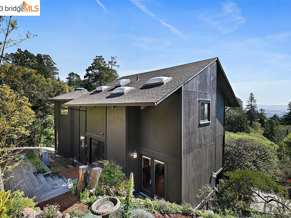 Hilltop oasis, on an oversized lot with expansive views of the Bay! Offers your most desired features. Privacy-- set high above the street, this home is nestled into a hillside. The backyard is dotted with colorful flowers & hugged by a grove of redwood trees. A home to entertain! Views-- a front door on the East side facilitates seeing the Western horizon whenever you come into the house. Large windows in the living room, loft, and primary suite all capture breathtaking sights. Natural light-- Pouring in through windows and skylights. Mid-Century charm-- wood paneling, soaring ceilings, a potbelly fireplace & uniquely shaped bedrooms nod to a well-respected era of interior design. Flexibility -- 2 plus spaces; the interior loft currently serves as an office. The under-home plus space as a studio, storage & laundry room combination. It even has a toilet! Don't be intimidated by the driveway. At the top&wait two covered and dedicated parking spaces for you. A private escape to entertain, offering views, filled with natural light, dripping charm & included flexibility. An amazing opportunity.