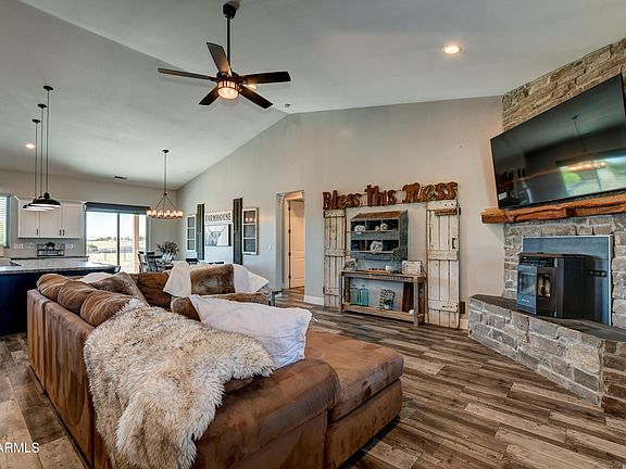 Welcome to your very own farmhouse! This home is a horse lovers' dream. This 2114 sf 3 bedroom plus office, 2.5 bath home was built in 2021 on just over two acres. It includes a 1396 sf 4 car tandem garage and a large horse barn. This beautiful home includes an open floorplan with LVP flooring, vaulted ceiling, cozy stone fireplace with pellet stove rated for 2500 sf. The kitchen includes granite counter tops, gas range, refrigerator, breakfast bar and walk in pantry with mini fridge. All appliances included! The laundry includes plenty of cabinets with a granite folding counter and utility sink, with a pass-through to the master! The large master suite features a big walk in closet, bath with separate shower and garden tub, dual sinks and granite counters. Outside theres a good size patio for bbqs, relaxing, and entertaining. Beyond the back yard, it's a horse lovers' dream. The 4 stall 1,485sqft Barn has its own separate APS panel, Pipe rail working arena, 2 tack rooms with toilet and running water, RV hookups and septic dump. Don't miss this amazing home!