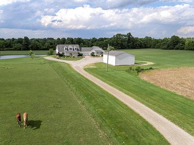 Wow, two houses for the price of one on 5+ acres! Unique Cape Cod with an open floor plan has an attached 2-car garage between the main house & Mother-in-Law house. Walk through the front door & be greeted by the striking Brazilian hardwood floors in the entryway, office, 2-story great room, sitting area, & dining area. Spacious kitchen has granite counters, lots of cabinetry, SS appliances, & walk-in pantry. 1st floor owner's suite has French doors leading to the screened porch with a spectacular view of the pond. 2nd house offers a full kitchen with all the appliances. LR with gas fireplace, 2 BRs, full bath, & laundry closet. Expansive pole bar has storage for a boat, tractor, and additional cars. Get the best of both worlds while enjoying country living with easy access to the highway and much more.