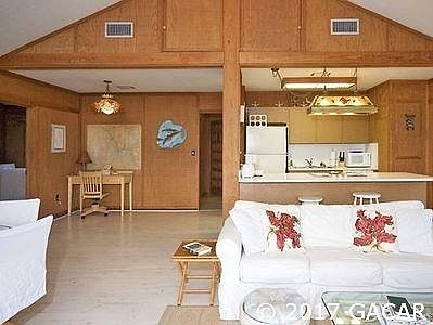 This gulf front home has a magnificent view of Sunsets in the Gulf of Mexico from any room in the house including large screened-in porch and outside deck area. Rye Key is the only gated community in Cedar Key. The home has a new metal roof and the home is move in ready with furniture and appliances included. Home has recently been updated with laminated wood and tile floors. Located in the only gated community on Rye Key. Parking area under the home includes enclosed storage area with new shelving. The exterior has recently been re-painted.
