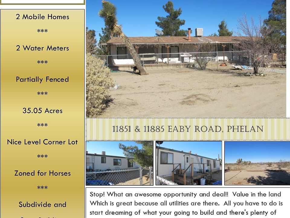 Stop Stop What an awesome opportunity and deal Check this out 35.05 acres... that's right - its not a typo Thirty five acres The rail road tracks do run through part, there are 2 mobiles on the property, one is rented until June 2 2014 - DO NOT disturb occupant. The 2nd needs some work - this is being sold as LAND VALUE ONLY There are 2 meters on the property, electricity and a shed, this is zoned RL 2.50 acres Buyer must honor lease and may preview after accepted offer! Cash offer for consideration only - again AS-IS - no inspections Land Value only!! Seller will carry with 60k down The mobiles are a bonus!