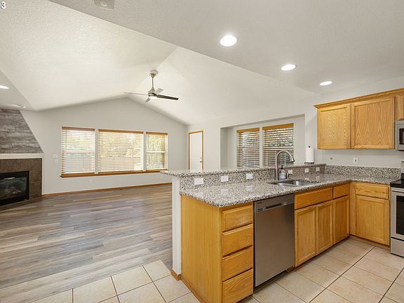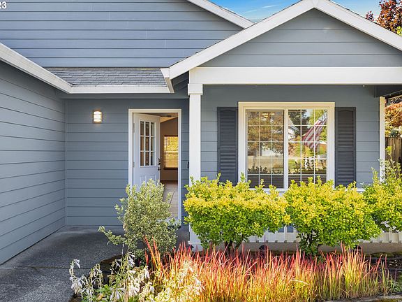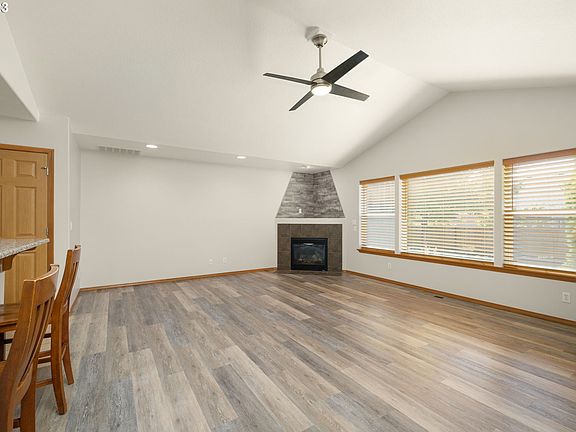 Impeccably well-maintained 1-level home on a spacious .23 acre lot! In a lovely cul-de-sac neighborhood, a huge extended driveway offers space for boat or RV parking. Entryway is welcoming with a covered front porch. Inside, French doors leads to a den/home office on the right and a spacious hallway opens up to a great room living area with vaulted ceilings and cozy corner gas fireplace. Kitchen has been updated with granite counters with an eating bar and stainless steel appliances. Home also has brand new central air conditioning, water heater, & luxury vinyl plank flooring in the den and living room. Primary bedroom comes with attached bathroom with walk-in shower, double sinks, & walk-in closet. Backyard features mature trees and landscaping with spaces great for any occasion including relaxing around the fire pit, dining on the patio, or enjoying the hot tub year round! Convenient location off South End Rd. just a couple miles from downtown Oregon City!