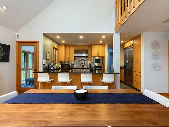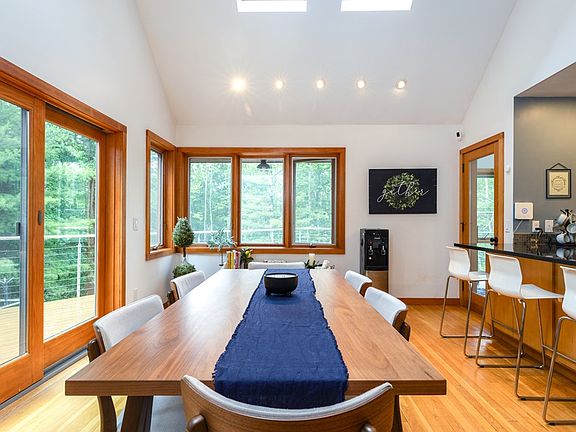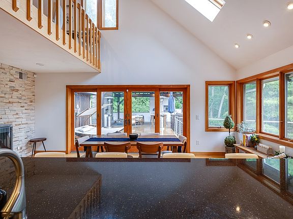 Stunning contemporary nestled on a wooded 7 acre lot. This 3/4 bedroom, 3 full bath, home is a true retreat. The outdoor space is a highlight, featuring a Brazilian style outdoor kitchen complete with pizza oven and tiled grill. Permanent roof and fireplace allow for year-round entertaining. Enjoy the composite decking and heated pool, perfect for enjoying the peaceful surroundings. Step inside to find vaulted ceilings that flood the space with natural light. Well equipped, contemporary kitchen, boasts professional appliances, perfect for the aspiring chef. Loft space functions well as a 4th bedroom or den/office. The primary suite is a relaxing oasis with a glass tiled bath, soaking tub. Central AC, custom lighting, modern gas fireplace, radiant heat floors. Electric car charge in garage