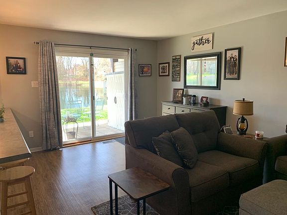 Updated 2 bed, 2 bath main floor condo overlooking the pond. The kitchen has an abundance of stylish new cabinets, island with additional storage, new countertops, breakfast bar with seating, and appliances that will stay with the home. There is a convenient eat-in dining space and large living room. The master bedroom is spacious and has an attached bath with additional closet space. The full hallway bath has been recently remodeled as well. Hardwood floor flows throughout the home. Enjoy the peaceful back patio on these upcoming summer nights overlooking the pond. This unit has a 1 car detached garage. Maintenance Free and a great location.