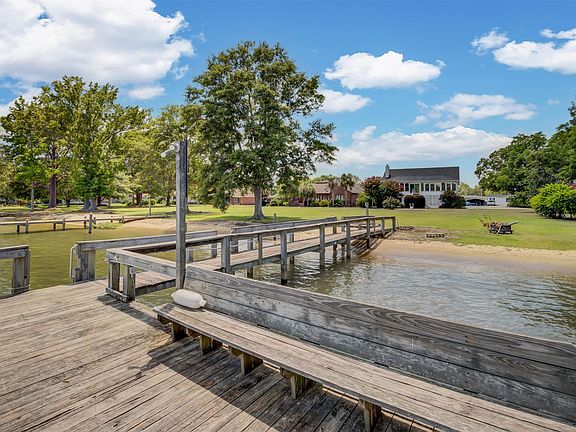 Beautiful waterfront property with views of Lake Marion's Taw Caw Creek. Enjoy your own private sandy beach and dock with deep water access that will take you right out to the Atlantic Ocean. Located just down the road from Goat Island and just a golf cart ride away from local restaurants and retail shops. This area offers everything from the best of fishing to golfing to boating and jet skiing. This home boasts 5 bedrooms and 3 bathrooms that spread over the 3,000 sq ft of the home. On the ground floor you'll find three bedrooms, two car garage, laundry room, and a bathroom. The top floor offers a foyer leading into the dining room, kitchen, two master bedrooms, a great room with fireplace. Enjoy views of the water from the 2nd story screened in porch. Appliances (2018) convey