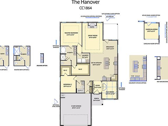 First-floor master suite with optional tray ceiling, spacious walk-in closet, his and hers sinks with optional center drawer stack in vanity, private water closet, and 3 bathroom options. - standard option with garden tub and separate shower - Option 1 with 36" x 60" tiled shower and linen closet - Option 2 with 42" x 72" tiled shower with seat and linen closetGreat room with optional tray ceiling, optional gas fireplace, or triple window.Eat-in Kitchen with island, bar seating, corner pantry, breakfast nook with access to optional covered porch, Carolina room, or patio, and optional accent wall. - Gourmet kitchen layout option with cooktop, double ovens, and pantry cabinet. - Wet bar option with extra sink and additional wall of cabinet space.Flex room with optional coffered ceiling and wainscotting detail, optional additional window, and french door option.Garage entry with optional coat station with bench and cubbies and coat closet.Laundry room with washer/dryer connections, optional base cabinet, and optional wall cabinets.Second bedroom with walk-in closet and hall access to full bathroom with tub/shower combination.2 car garage with optional pedestrian door.