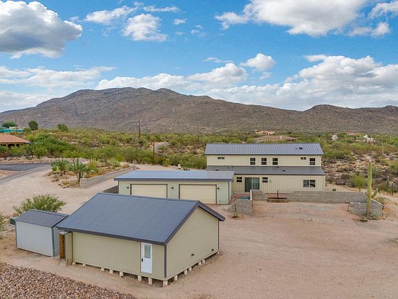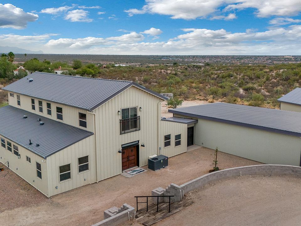 Discover a captivating blend of modern design and open desert living in this 2023 custom-built steel home, set on 3.6 pristine acres right across from Saguaro National Park East. The open living area features high ceilings and a gourmet kitchen with ample hardwood cabinetry, butcher block counters, and GE Cafe appliances. Retreat to the private 1,400 sq. ft. master suite upstairs, offering stunning city and mountain views. The oversized 4-car garage and 750sqft detached workshop means room for projects and toys. RV and EV hookups available, pre-run electric and plumbing combined with the private registered well,would make for easy multi-generational possibilities , serene desert setting mean you have room to grow and dream big. Full list of features available in the documents tab.