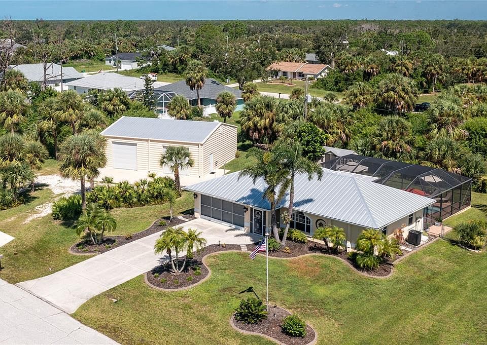 Discover the Ultimate Entertainer's Paradise Here! Situated on an oversized lot that includes a separate 1400 sq ft garage and a backyard that was made for true Florida living, this home offers something for everyone. A metal roof, impact garage door on the main house, entire home hurricane shutters and located in an “X” flood zone add additional peace of mind. A screened entryway provides a warm welcome inside where you will find gleaming tile floors throughout, vaulted ceilings, and upgraded lighting fixtures. The great room has plenty of natural light from the unique design of the oversized windows. The nice sized dinette has charming chair rail and sliding glass doors that provide phenomenal views of the pool and backyard retreat. White cabinets, Corian countertops, open shelving, stainless steel appliances, and a reach-in pantry will be the perfect place for the cook in the family. The split bedroom plan offers privacy to both you and your family and guests. The master bedroom ensuite has plantation shutters and pool access through the sliding glass doors. The master bathroom has been recently renovated to include a gorgeous white wood vanity with quartz countertop and glass door enclosed walk-in shower. The two additional bedrooms both feature reach-in closets and the shared bathroom has also been recently updated with a frameless glass door walk-in tiled shower. Step into the backyard and find yourself immersed in a tropical haven. Wood look tiles combined with pavers surround the 2016 built heated saltwater pool that features fountains, therapy jets in the walls, and sun shelf with built-in umbrella or table stand. Just outside the screened lanai you will love having a paver patio with a fire pit will be the perfect spot to relax by a crackling fire with a cocktail on the cooler evenings. A small shed will thrill the gardener in the family. Do your hobbies include boating, classic car collecting, or motorcycles? If so, then you will love the separate garage with two doors that can accommodate your boat and RV, a standard height garage door on the back, plus a convenient single entry door. This garage was built for those needing additional space to house their toys. This home is located in Englewood East so you can easily be at your favorite area beach or golf course in less than 10 miles. There are a variety of shopping options and local restaurants close by. If you are ready to start enjoying the life you have dreamed about, take the visual tour and call for an appointment today!