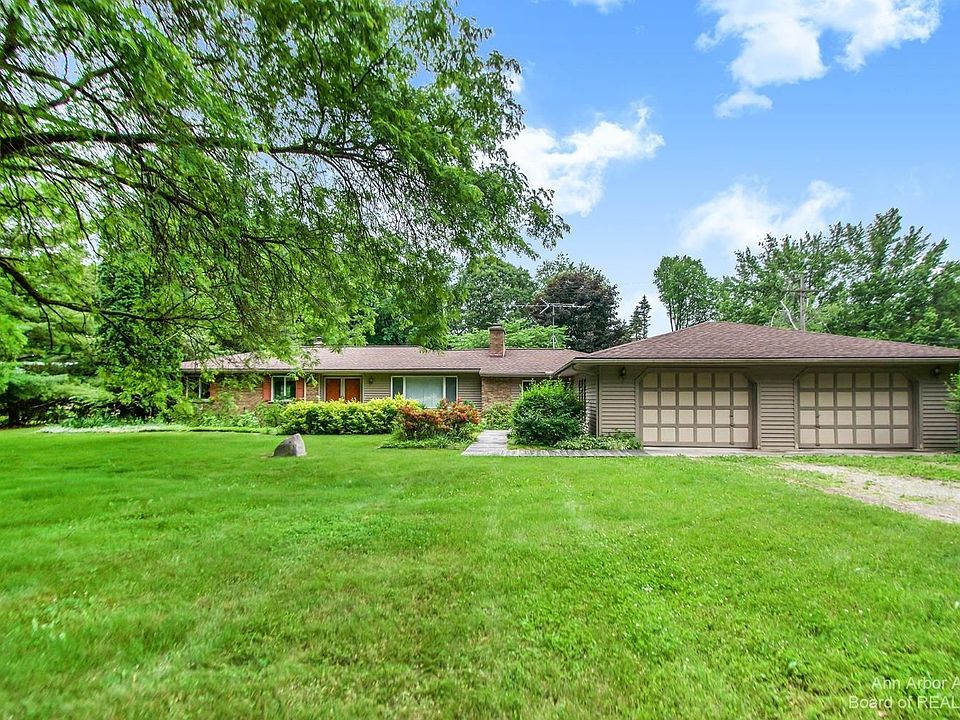 Spacious 3 bed/2 bath ranch on a large acre not far from town! Massive family room addition with beautiful oak wall fireplace & windows seats on either side is a great space for family gatherings. Combination dining and kitchen offers snack bar, pantry & door wall to generous deck in the private tree lined back yard that lives larger than its size. Front living room features a 2nd fireplace with brick wall & double doors to the front deck with walkway. Primary bedroom features full private bath while 2 additional bedrooms share 2nd full bath. Plenty of storage with several nice closets, including the side entry leading to the 2.5 car garage, extra deep on one side. Good size basement with clean, dry, painted floors, tall enough ceilings to finish as you like, house the laundry, canning closet & storage room with built in shelving. Gorgeous setting with tons of mature trees and landscape, yet just a quick trip to Chelsea, Chelsea Schools and super easy highway access. Some cosmetic improvements would go a long way to make this home your own!