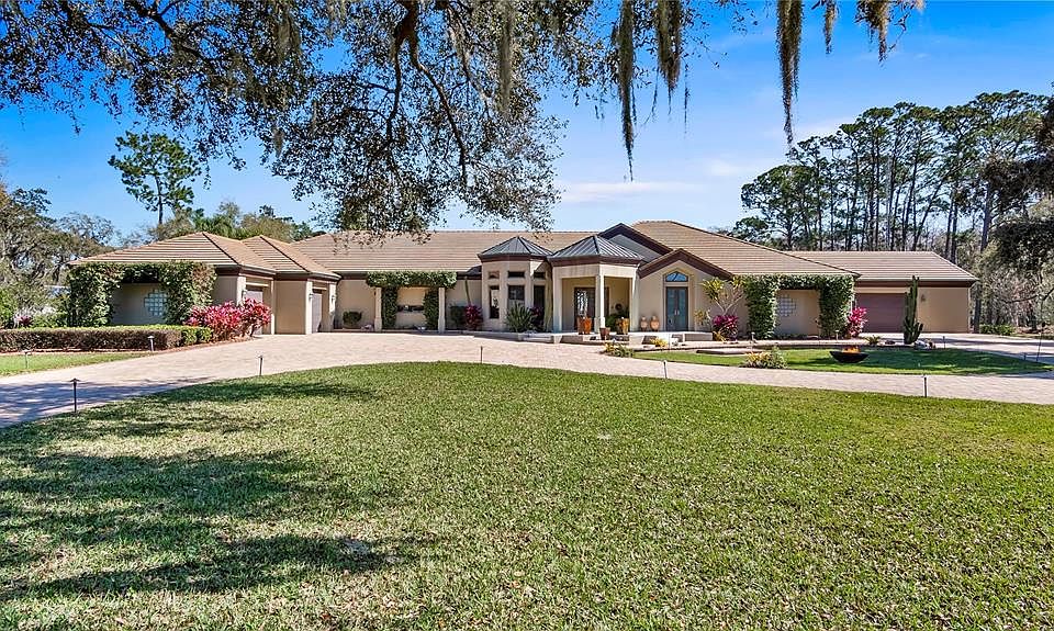 One or more photo(s) has been virtually staged. A Clermont Chain of Lakes direct waterfront home on over 6.5 acres with a gorgeous custom residence and no HOA. Waterski, wakeboard, kayak, fish, or just boat on 13 lakes— with Lake Louisa State Park just off your shoreline. Vacation every day in this fabulous property. Privacy is afforded behind the estate wall as the gate opens to reveal a concrete-paved, circular driveway around a stately old oak tree and manicured grounds, including a vineyard and seven producing citrus trees. The travertine front steps, accented by fountains and lighting, lead you through the custom Patina Copper front doors with views past the pool and rear yard to the lake through the 24-foot wall of sliding glass doors. This great room has 14-foot ceilings with specialty upgrades, including a cocina stone wall and custom lighting to accent tilework, ceiling coves, and niches. The music room has mahogany ceilings and fixed windows at the front of the home, making it an amazing home office, library, or reading space. The kitchen is phenomenal with panoramic views of the lake from almost every angle. Complete with Rutt custom-made cabinets around a large island with granite counters and seating, this is an incredible space for cooking, baking, and entertaining. Dacor double convection ovens plus a warming drawer and seven-burner cooktop, raised Bosch dishwasher, a Sub-Zero under-counter two-drawer refrigerator, a Sub-Zero refrigerator and freezer, and a Kohler cooking sink are more kitchen features. The butler's pantry off the dining room and the wet bar off the kitchen make entertaining easy. The family room boasts matching octagonal 14-foot mahogany ceilings, and the music room has an amazing gas (or wood-burning) fireplace accented by three cocina stone walls and seamless glass overlooking the gorgeous lanai and pool. The kitchen, bar area, and family rooms flow together for optimal everyday living or entertaining. The primary bedroom suite occupies one side of the home, and has a built-in California King bed, a sitting area with desk/library/TV niche, and views of the pool area. The bath has a Kohler ten-jet/waterfall shower, an adjacent Grohe shower, and an aquatic jetted tub. The walk-in closet also serves as a hurricane room, has extensive shelving and an island with drawer space. Just off the primary suite, another bedroom (currently being used as an exercise room) offers a full bath/steam shower and pool access. Another smaller bedroom has private access to an amazing screened-in butterfly garden lanai. A second ensuite bedroom has a great lake view, a large walk-in closet, direct access to the lanai and pool, and an amazing bath with a waterfall shower and a jetted tub. The separate in-law suite has a full bath, walk-in closet, and kitchenette with two large windows overlooking Lake Louisa. The lanai area is fantastic—lush tropical landscaping strategically placed so as not to obstruct the water views or the starry skies, and the 16,000-gallon pebble tec lagoon pool has a fabulous waterfall feature. Relax by the pool under the misting fans, grill at the Dacor electric grill or host a huge party or wedding here. There are five-car garages, an interior fire sprinkler system, Anderson windows and doors, and a full list of upgrades for you. Located within 45 minutes to Orlando International Airport, Universal, and Disney, but less than 15 minutes to shopping centers and department stores. See the interior/drone video and make your appointment today!