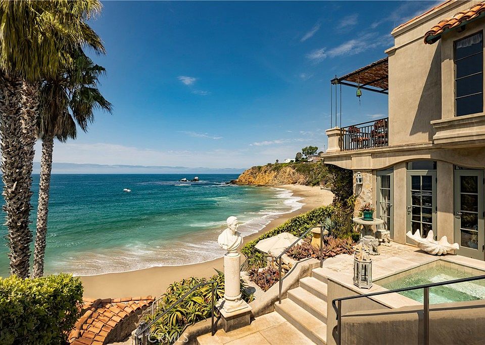 This is the home one dreams of but never expects to find in the real world. This perfect oceanfront setting is complemented by a residence of exquisite style. Never to be replicated under current building restrictions, the villa is carefully positioned into the site just above the water’s edge. It takes advantage of the grandfathered position of its predecessor and as such, rests comfortably on the site as if it was always meant to be. The result is a unique relationship between the interiors and the vistas of the rugged coastline, azure waters, and sunsets that is simply unequalled on this coast. Nearly 7,000 square feet of living area was painstakingly designed by the esteemed firm of Tichenor & Thorp in a coastal Italian style. It takes full advantage of the scintillating and experiential sensory opportunities of the setting including the ocean breezes, sounds of the crashing waves, and the golden light that bathes the house throughout the day. The interiors are refined and comfortable, with each room carefully layered by a studied eye with antique materials and exceptional craftsmanship. The result is both harmonious and elegant. The house features a flowing, open, and eminently livable floor plan where one gracious room leads, uninterrupted, to the next. French doors open from every major room to seaside terraces and mature European gardens all cascading toward the shore. Antique inlaid garden walls dating back over 100 years create outdoor rooms, overlooks, and guide a private path to the sand below. The primary suite is situated on the top floor and enjoys a majestic positioning. It includes a private view terrace, a Moroccan themed bath, and ample closet + dressing area. Another ocean view suite shares this floor. The main level includes the living room, which adjoins the paneled family room. The family room leads in one direction to the bar, guest bath, and main guest suite. In the other direction, it leads to the formal dining room, immense kitchen, and a sea view morning room. A large view terrace on this level is complemented by a fireplace and offers a wonderful setting for entertaining and dining. The lowest level functions as a complete ‘guest house’. Carefully positioned terraces and overlooks are sculpted into the bluff and adorned with colorful and flourishing gardens. The opportunities for living and entertaining here are beyond compare, yet it retains a luxurious ambiance and extraordinary privacy. In a word, this home is “perfection”.