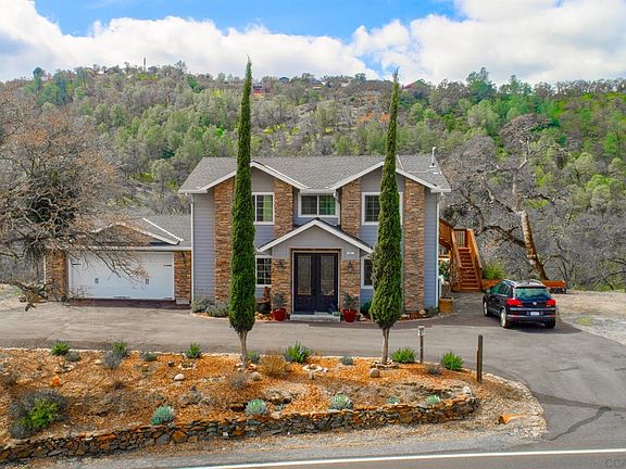 Welcome to your country dream home on a spacious, 1.4 acre corner lot in Copper Cove Subdivision at Lake Tulloch! Phenomenal views of rolling hills, Black-creek, and oaks. Expertly planned entertainer's backyard with covered and uncovered concrete patio areas, elegant steps, retaining walls, flowerbeds, beautiful landscaping, exterior lantern lighting,+ a full outdoor kitchen with BBQ, sink, and wine fridge! Plenty of room left to add a pool or hot tub. The immaculate exterior features rock detail, wood siding, custom paint, & stately front double doors. Upon entering the vaulted entry with chandelier, you'll encounter gleaming Travertine floors in all downstairs living areas & tasteful light fixtures/fans throughout. This home is the epitome of light and bright and shows amazing pride of ownership! The updated kitchen features granite countertops, stainless steel appliances & a gorgeous view of the backyard & the hills from the sink window and French doors. Prep on the custom industrial-farmhouse style kitchen island w/metal top. The dining room w/Tiffany light fixture opens to the spacious living room. Additional bonus/TV room/den/possible 4th bedroom w/French doors to the rear patio is perfect for guests or multi-generational living. Gorgeous & updated full bath is right next to the bonus rm. This well-planned home contains 7 Klimaire mini-split heat/A/C systems for energy efficiency. Each person can adjust to their liking. Head upstairs to another roomy upstairs living space w/French doors leading to an upper deck. Breathtaking views! The master bedroom also features views and is spacious w/room for a sitting area. Upstairs full-bath features beautiful custom floor to ceiling tiled shower, marble floors, granite-topped vanity, & sensor lights. Two more bright guest bedrooms finish out this level of the home. Laundry area is in the oversized 2-car garage w/windows and door to rear patio. Situated on a hill, this home is private w/top-of-the world views & no neighbors in sight. Room for your animals,crops, or to relax & entertain. The rear, landscaped yard is the perfect place to enjoy a picnic or wine & cheese in the evening. Paved, u-shaped driveway offers tons of parking + easy access for a boat, RV, or guests. In addition, owner has fenced chicken coop area. Enjoy farm-fresh eggs from your own backyard! Rock outcroppings + a small grove of oak trees add to the ambiance. This home is all electric w/SOLAR for lower energy costs. Enjoy all the amenities of Copper Cove: Kiva boat launch, beach, and docks, bbq pits, Blackcreek Park, sports courts, sports fields, clubhouse, gym, & riding trails for a low HOA of just over $20/month. Copperopolis Town Square is close by & features a new hotel, dining, wine-tasting & shopping. Award-winning golf at Troon-managed Copper Valley + fine dining at Vine-18,just minutes away. Explore nearby Angels Camp, Murphys, Sonora, or Oakdale for shopping, dining, wine & fun. 1 hr to snow, 2 hrs from the Bay!