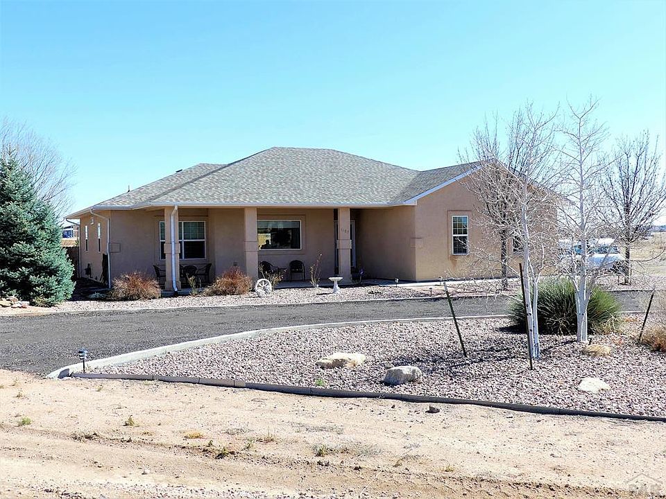 Great condition, great location, great price on this move-in ready, Pueblo West, ranch style home! This home has 5 bedrooms and 3 baths with over 3000 finished square feet. It is situated for privacy, on a 1.08 acre lot that backs to 80 acres of church owned land. On paved road, which keeps the car clean! The kitchen has been nicely updated with granite like counters & comes with all appliances including range, dishwasher and microwave that were all new in the last couple of years. Nice hardwood cabinets in kitchen and beautiful hardwood floors in kitchen, dining, living room and hall way. Quite a bit of main level has fresh new paint. Much of the basement was finished in the past 3 years, all with permits, so much of that is almost new! The main level features the popular separated bedroom floor plan, with large master suite with 5 piece bath and generous walk-in closet. You'll love the beautifully landscaped yard, both front and back. There are numerous attractive outdoor living areas, including fire pit area and huge covered front porch. Plenty of room to build out building or for RV parking! 9-10 foot ceilings, both main level and basement. Walk-in closets in both the basement bedrooms. Two living areas in the basement, one that would be ideal for a home theatre. Light and bright throughout this home. Wonderful laundry room off the master with hanging and folding space. Garage is an oversized two car with two windows for more light.