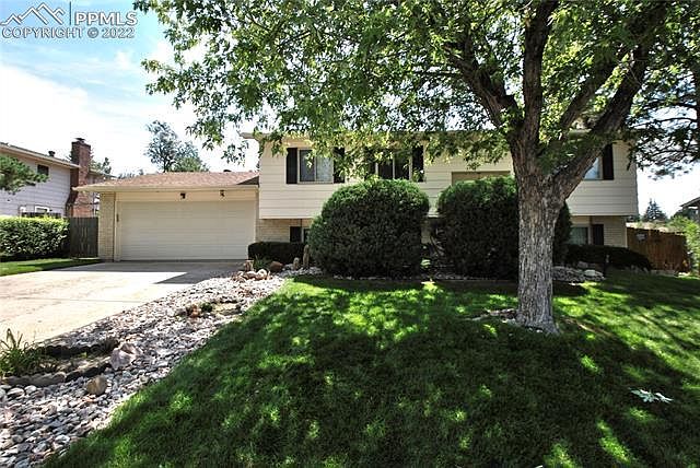 IMMACULATE CONDTION INSIDE AND OUT!! Gorgeous yard accented by huge patio and a covered deck plus shed. Champion vinyl windows with fresh exterior paint and roof plus newer vinyl slider door that opens into oak kitchen full of all the appliances. The upper level has formal living and dining areas plus 3 nice size bedrooms. Lower level has big family room accented by gas brick fireplace plus two more bedroom areas.The laundry room includes the washer and dryer plus more storage. Swamp Cooler keeps things cool & sprinkler system makes for easy outdoor care. Only minutes away from Peterson Air Force Base & Schriever Air Force Base. Move in Ready!