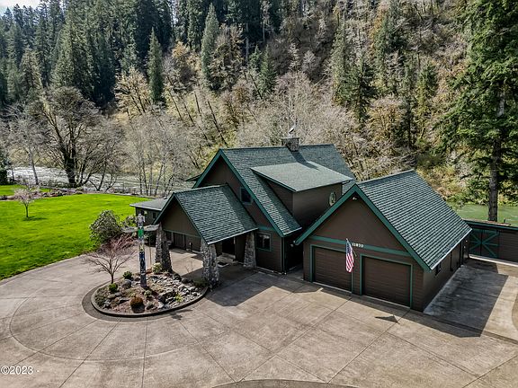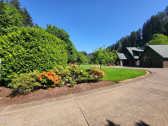 Oregon Coast Alsea Riverfront Craftsman Home with a wall of windows to enjoy the beautiful river and forest views! Floor to ceiling river rock fireplace with woodstove insert, spacious living room, dining room and full kitchen with oak cabinetry, granite countertops and stainless steel appliances. Main bedroom with full deep tub, double sinks and walk in shower on upper level, 2 beds and full bathroom on lower level. Detached 2 bay garage/shop with fish cleaning station room, built in storage cabinets. Wrap around deck, hot tub room, gazebo, chicken coop, gated property with mature landscaping and a variety of fruit trees! Fully fenced irrigated yard with timers and drip/mist. Power and water available for woodshed, smoke room, pumphouse. Truly a must see!