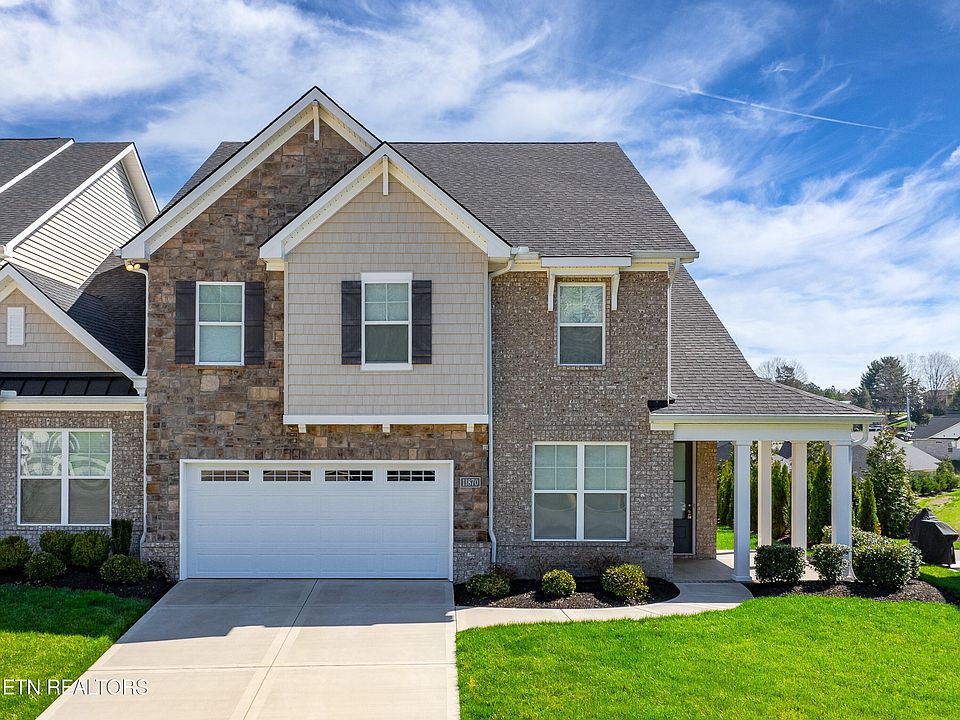 This sumptuous end unit townhome is an entertainer's dream and offers the pinnacle of luxury living for those who appreciate the finer things in life. This stunningly unique townhome was meticulously designed and offers modern sophistication with spacious living areas, high-end finishes and views over a serene, stocked pond with resident geese. The location is just as prime as the amenities, situated in a desired community in the in-demand Knoxville area, close enough to walk to Turkey Creek and within easy reach of premium shops and top-rated schools. A dynamic brick exterior with stone accents gives your new home great visual appeal as you pull up to the attached 2-car garage. Step through the inviting covered front porch to discover the beauty that awaits within. From the moment you enter, natural light floods the home through the many windows, dancing off fresh flooring, inviting you to bask in its glow. Coffered ceilings and crown molding draw the eye upward, while the upgraded wood-look flooring grounds the space in inviting warmth. The focal point of this residence is the impressive kitchen that seamlessly flows into the expansive great room, complete with a sizable dining island topped with gleaming granite countertops. This gourmet space furthermore sets the stage for gastronomic delights with its gorgeous shaker cabinets with undermount lighting, custom tile backsplash, stainless steel appliances and ample pantry storage. This voluminous open concept layout boasts views in every direction with windows all around thanks to its end unit position and the indoor/outdoor lifestyle that awaits on the covered rear porch is also a perfect example of the wonderful livability of the home. A lighted ceiling fan echoes the comfort found indoors and the pond view, no immediate rear neighbors and lush lawn all create a soothing environment to host guests or simply kick back after a long day. Back inside, the main floor yields two bedrooms and two full baths. The first is a spacious guest bedroom and the second is the primary suite that manifests ultimate relaxation with grand tray ceilings and luxe ensuite bath complete with dual sinks, soaking tub, separate glass shower and walk-in closet. There is a laundry room conveniently placed on this floor for effortless handling of daily chores. Upstairs offers yet another level of fine amenities. Right off the landing you will step into a fantastic bonus room that offers the flex space for a variety of needs, from a media space to a playroom, hobby room, or games room. There is another room on this floor that likewise provides dual usage, from that as an extra bedroom to that of a private home office. Another dedicated bedroom and full bathroom complement this level, and a walk-in attic plus linen closet means a ton of storage options! Balancing views, scale, and comfort to create a living experience that accommodates a range of interests, this end unit not only lives like an independent home, but this quiet residence also enjoys a setting amidst new homes in a neighborhood kept in immaculate condition with HOA that maintains all exterior lawns and gardens. Spend Easter surrounded by the allure and grandeur of this exceptional townhome, creating cherished memories in a setting of unparalleled beauty and luxury. Buyer to verify all information.