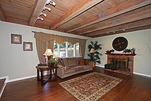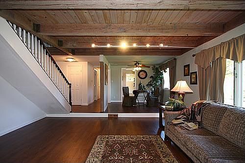 This lovely home is complete with gleaming laminate hardwood floors throughout most of the first level, wood beam ceilings, and a sparkling pool with gated entry. The step-down Living Room offers open woodbeam ceilings, custom window coverings, and is open to the Formal Dining Room, staircase and main hall. The Formal Dining Room features custom paint and window treatments, and ceiling fan. The Kitchen is open and spacious with new stove top, range hood and dishwasher. The Master Suite is located on the first level, with attached bath and ample closet space. Three additional bedrooms are located on the second level, along with three bathrooms. The backyard is complete with gated pool and large grass area for recreation. This one is a must see!