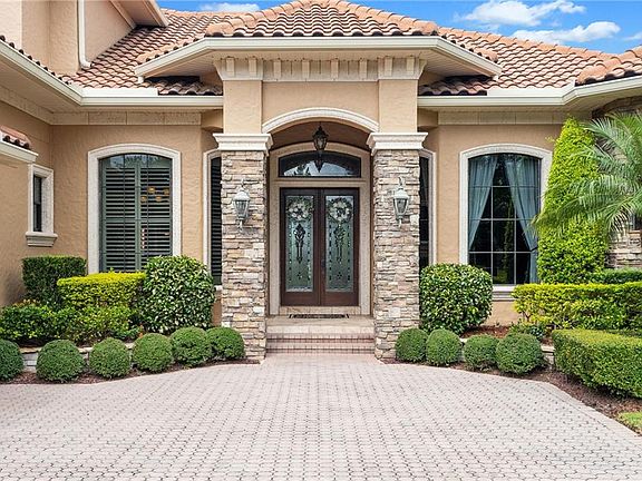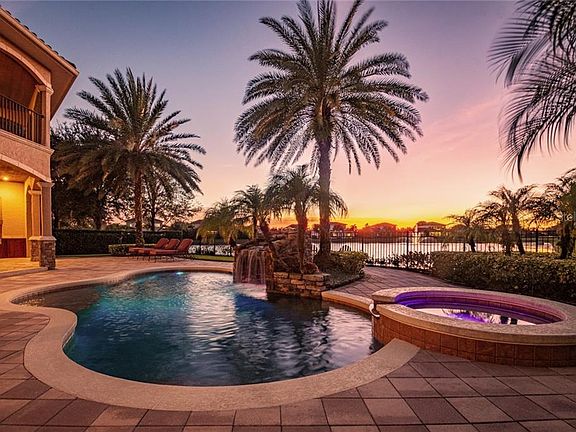A Former Model and Parade of Homes winner in 2009, this impressive 4 BR/4BATH/2half bath custom home has TWO MASTER BEDROOM SUITES AND HAS BEEN A VACATION retreat for the current original owners. Located in the more recently built Village of "The Gardens" in Keene's Pointe, this beautiful residence enjoys a lovely park to one side and a large pond with lighted fountain to the back. EVERY DAY IS A VACATION DAY HERE with sunset views, Disney fireworks and a resort style, saltwater pool with rock grotto waterfall, hot tub, and open lanai ideal for sunbathing. On the first floor is the primary master suite with luxurious master bath along with two secondary bedrooms w/2 full baths, formal office, half bath, LR , DR and huge Kitchen/Family Room just perfect for hosting large gatherings. The master suite, LR and Family Room open to the pool area. Upstairs you will find the other master suite w/large bath, loft/study area, half bath and fabulous game room with large bar and screened balcony to enjoy the views. Travertine floors grace the main living areas downstairs, while upstairs you will find unique bamboo flooring. Other upgrades include nearly new gourmet appliances, whole house sound and security system, wood inlaid ceilings, leaded glass doors and windows and stacked stone accents all around. Built by Sauerwine Custom Homes, the exterior was painted in 2017 and this home also offers lush, tropical landscaping, a big fenced yard and a tandem style garage that fits 3 cars PLUS a golf cart! Furniture package available separately.