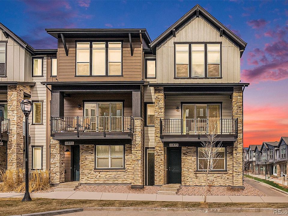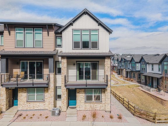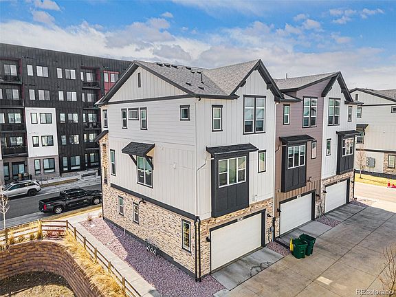 Experience modern living with stunning mountain views in this upgraded 2022-built end-unit townhome in the heart of Wheat Ridge! This prime lot location offers a south-facing entrance and no direct neighbors to the East, as it borders the beautifully maintained community grounds—providing additional privacy and tranquility. With ample street parking available, hosting guests is effortless. This spacious 3-bedroom, 4-bathroom home boasts an open-concept design with soaring ceilings, thoughtful upgrades, and abundant natural light throughout. As you enter, you're welcomed by an en-suite bedroom with a full bath—ideal for guests, a private office, or a home gym. The attached 2-car garage is also conveniently located on this level. The second level is an entertainer’s dream, featuring 10-foot ceilings, expansive windows, and seamless flow between the living, dining, and kitchen areas. The chef’s kitchen is a showstopper, offering quartz countertops, high-end appliances, custom cabinetry, and an impressive 5x6 foot island with wraparound storage. A spacious pantry provides additional organization, while the living area opens onto a covered balcony—perfect for enjoying sunsets and south-facing sunshine year-round. A half bath on this level adds extra convenience. Upstairs, the luxurious primary suite includes vaulted ceilings, a spacious en suite bath with a walk-in closet, and a dual vanity. The third bedroom impresses with soaring 14-foot ceilings, an en-suite bath, and generous closet space. A conveniently located laundry area fits a side-by-side washer and dryer. Perfectly situated with easy access to downtown Denver, Olde Town Arvada, and the mountains, this pet-friendly community is just one block from the light rail and minutes from I-70, making commuting a breeze. Turnkey and move-in ready—don’t miss your chance to see this stunning home today!