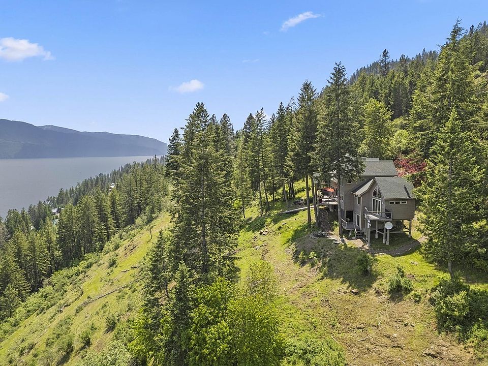 Seller Financing Available! Nestled above Garfield Bay in Sagle, this private custom home has sweeping lake and mountain views from every room. Specially engineered and designed, this home brings you all that you need! Inviting bright open kitchen and living space that centers around the panoramic views with the large floor to ceiling windows. Real wood floors and beautiful vaulted ceilings. The primary and downstairs room both have their own private deck giving guests plenty of space of their own. Along with a 2 car garage there is an elevator from the driveway to the main level, a whole house generator and emergency 4000gal backup cistern . Enjoy the day on the large open deck and additional screened in porch. Trails and waterfront fun are just down the road, with access to thousands of acres of national lands. Free internet included, community well and community waterfront for private ventures! Don't miss this home and all that it has to offer. See Matterport for home layout.