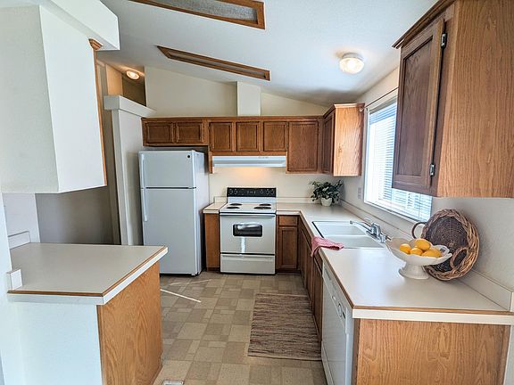 Vaulted ceilings, all sheetrock walls make this home bright and feeling like any stick built home. $650 monthly space includes water, sewer, irrigation and automatic sprinklers, mowing, debris pickup, community center, and a beautifully maintained park. RV parking available. Come take a look today!