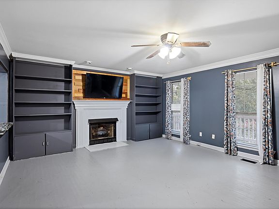 Main-level primary suiteUpdated kitchenCustom built-in shelvingSlightly elevated lotPeaceful wooded viewsDining areaWelcoming oversized front porch