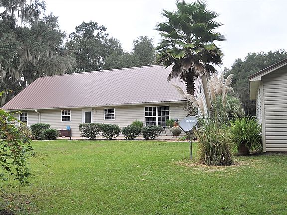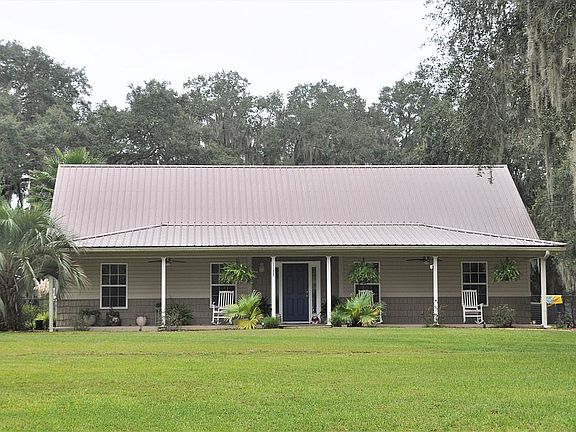 Immaculate condition, easy living with open floor plan! Metal Roof was installed in 2016. This welcoming home features a rocking chair front porch, detached garage/workshop and over 1 acre lot. Living room offers built in bookcase around the Gas Fireplace, hardwood flooring and open to dining area and Kitchen. The kitchen features white appliances and breakfast bar. Behind the beautiful barn doors next to the kitchen is the pantry area and Laundry Room. The primary bedroom features hardwood flooring and En-suite bathroom with dual sinks, tile and tub/shower. Bedroom #4 is located upstairs with En-suite bathroom. Such a fantastic yard with several mature Live Oak trees! UTILITIES: GA Power- $175/mth avg, septic tank, public water and there is a private well for lawn irrigation. Gas fireplace operates with a rented propane tank. Age of HVAC is 2019 and water heater is 2016. Easy to show.