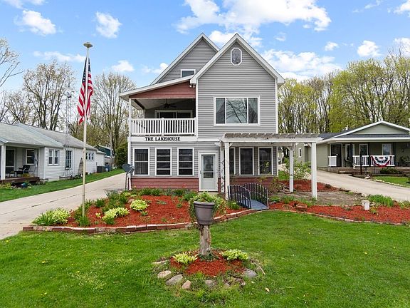 Picture owning a piece of Paradise with 50ft of Lakefront on Wall Lake, a beautiful fishing lake. Imagine spending your summers in this stunning three story, lot level, unique home. That rest on an extra deep oversized lot, with manicured flower beds, nice backyard, rear lot with lots of parking and plenty of storage for toys and a shed. This two owner home has a large 3 season room overlooking the lake, a family room with a gas fireplace, full kitchen, bunk room, and a full bath on the main level. On the second level has a living room, full kitchen with bar island, sitting room Lakeside, also outdoor covered patio on lakeside, bedroom and full bath. On the third floor is two large bedrooms, full bath and a playhouse. Home also has large 2+ garage, above ground pool, 12x16 shed next to pool with attached covered patio with hardwood floors throughout the home. Also there is a fire pit lakeside. Seller has done many many update. Call today for your private showing!
