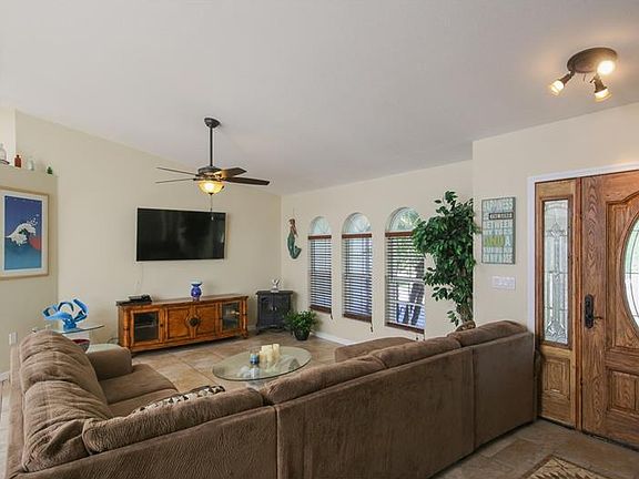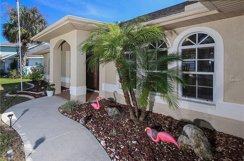 Florida living at its best, this home is situated on 1 ?? lots, providing room to park your boat/RV and favorite toys! The tropical landscaping, triple palladium windows, and covered tiled grand entrance are just the beginning. The elegant wood door with leaded paned glass and sidelights opens to reveal your very own private retreat. As you enter, the view of the sparkling pool and large screened lanai, both added in 2015 and private fenced backyard take center stage straight ahead. Open the pocketing sliding glass doors and extend your living space out to the lanai and pool, soon to become your favorite room! The open floor plan and vaulted ceilings add even more volume to this spacious home, always bright and cheery with natural light flowing through. The palette of designer accents speaks to the quality of this home, including chair railing, wainscoting, decorator paint colors, granite countertops, wood cabinets, stainless appliances, upgraded lighting and ceiling fans, stylish tile flooring, and so much more. You'll wake to shimmering pool views through sliding doors in the master bedroom, and the split bedroom floor plan provides extra privacy. Enjoy a cup of coffee in the breakfast nook as you plan your day. Take a dip in the pool after spending time at the beach or local golf course, and have fun with the pool's disco light after the sun sets! The gourmet kitchen opens to the living area, making this the perfect space for entertaining. No flood insurance required. Live the dream!
