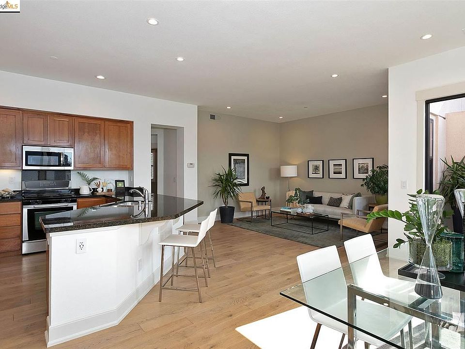 Contemporary two bed/ two bath upper corner condominium in prime Oakland/Emeryville location just blocks to amazing restaurants, Berkeley Bowl, & BART. Enjoy this light-filled open living room, kitchen and dining room with beautiful hardwood floors and high ceilings. Complete with a private balcony to dine with views to the East Bay Hills. Updated kitchen with a large center island and stainless-steel appliances. Spacious master suite with walk-in closet, second bedroom with second bath, and in-unit laundry. All one level! Comes with an in-unit elevator if the stairs are a challenge. Attached one-car garage with extra room for storage.