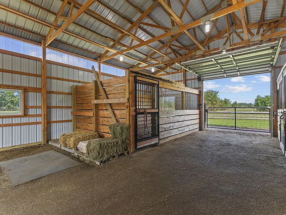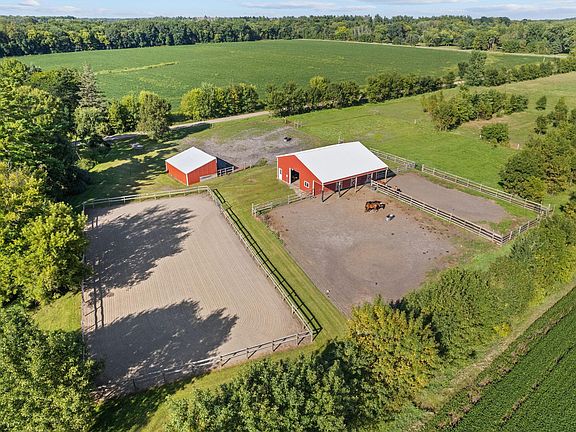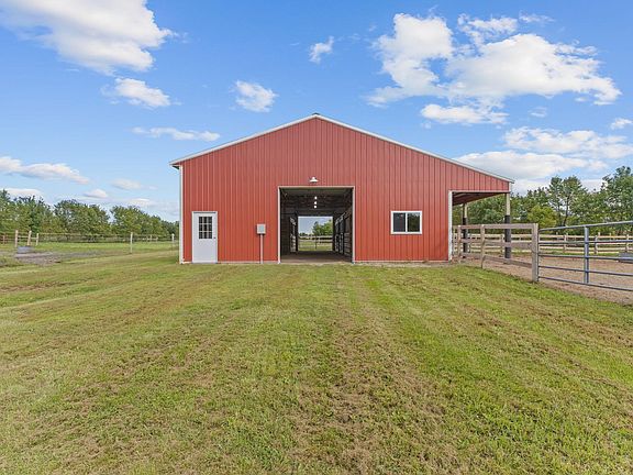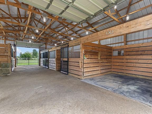 The horse facility is a fully equipped barn/pole shed with three 12x12 stalls, one 19x11 stall with all stalls including mesh grid stall doors and dutch doors that lead directly to the paddocks. A groom stall, wide open area for hay storage, large overhead doors on both ends with openers and lean-to overhang on the south side. A well designed pasture layout includes 2 grass pastures and 4 dry lots encompassing approximately 5.5 acres of the property, all lined with electro braid fencing. A 32x21 lean-to in the dry lot includes an automatic waterer. The 60x120 outdoor riding arena was professionally installed featuring footing that follows the USDF under foot guidebook. A 40x36 pole shed equipped with four overhead doors creates a 3 car garage with a side entrance for access to storing other equipment. 200amp electrical in this building also includes an electric car charging area. A property to not miss!