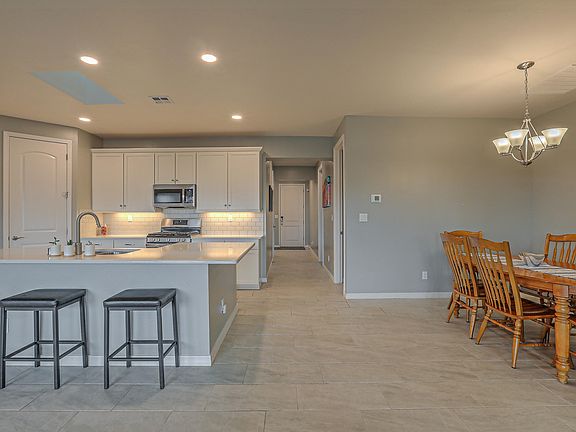 Welcome to this extensively upgraded Selena floor plan with more charm than a model home! Presenting a spacious open floor plan w/ huge kitchen island, 12 x 24 tile throughout main living & primary bedroom, 8' doors, 4'' molding, skip trowel walls, refrigerated ac, custom lighting in the living room, elevated granite counters in the kitchen & baths. The kitchen boasts 42' white cabinets, crown molding, under mount lights, large pantry & soft close drawers. Spacious primary bedroom w/ large bathroom, floor to ceiling shower tiles, dual shower heads w/ rain shower & a custom closet system to be envied! Smart home technology w/ electronic locks, lights & thermostat. Water softener and hot water on demand. Beautifully landscaped yard on a drip system with an extended covered patio. Must see!